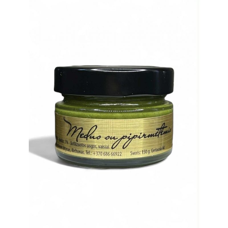 Ekologiškas medus su liofilizuota pipirmėte.